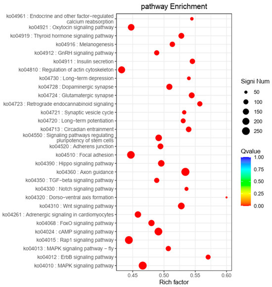 We discovered that 4368 SSR-containing exons were assigned to 258 KEGG pathways, such as “cellular processes” (1680 SSRs; 18.19%), “environmental information processing” (2488; 26.94%), “genetic information processing” (642; 6.95%), “metabolism” (882; 9.55%), and “organismal systems” (3545; 38.38%). Several pathways associated with immunity and growth were enriched in SSR-containing exons: “Hippo signaling pathway”, “TGF-beta signaling pathway”, “insulin secretion”, “regulation of actin cytoskeleton”, “thyroid hormone signaling pathway”, and “Wnt signaling pathway” (Figure 7).