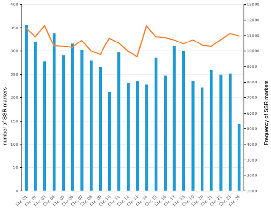 The abundance, frequency, and density of SSRs in each chromosome and whole genome were calculated and analyzed by Excel 2019 (Microsoft, Redmond, Washington, DC, USA).
