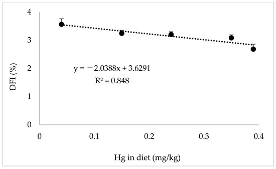 Linear correlation between Hg content in the diet and daily feeding rate.