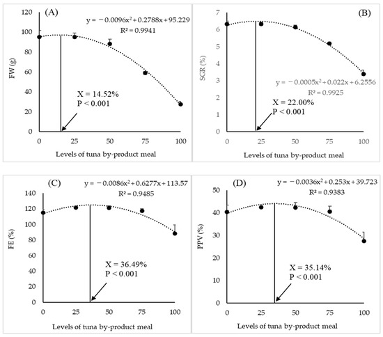The quadratic polynomial regression analysis of the final weight (A), specific growth rate (B), feed efficiency (C), and productive value of protein (D) against the dietary levels of the TBM. The arrow indicates the maximum level of FM substitution for TBM in the diet of juvenile greater amberjack.