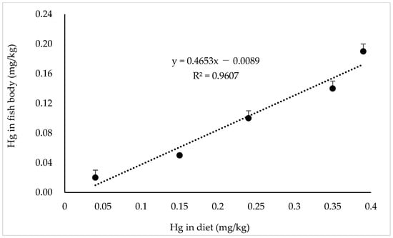 Linear correlation between Hg content in diet and fish whole body.