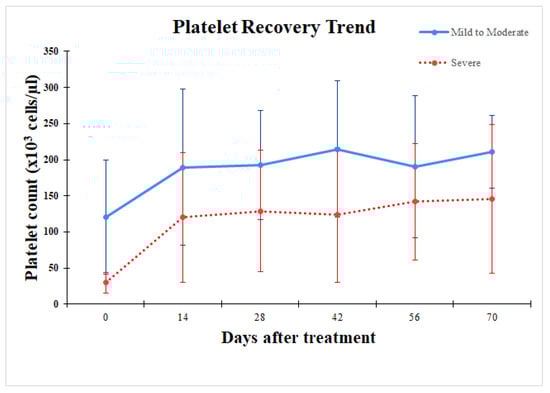 Trend of increased number of platelets before and after treatment in the mild-to-moderate thrombocytopenia group (solid line) compared to the severe thrombocytopenia group (dot line).