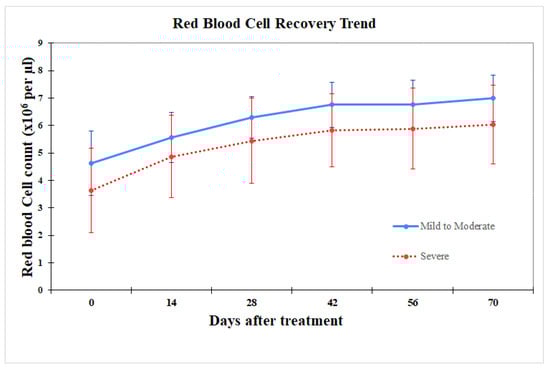 Trend of increased number of red blood cells before and after treatment in the mild-to-moderate group (solid line) compared to the severe group (dot line).