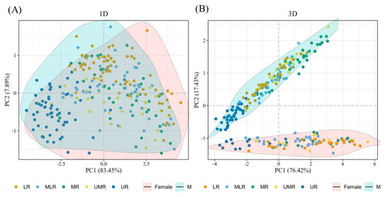 Further PCA analyses by geographic population segmentation revealed that the explanatory rates of the two principal components obtained from the 3D morphological data were higher than those obtained from the 1D morphological data for both sexes and that the morphology of the UR population showed a clear distinction from the other populations (Figure 3).