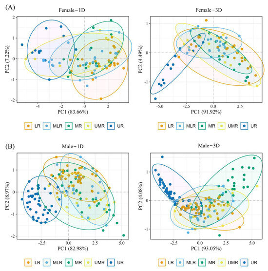 Results of PCA of B. gargarizans in lower reaches (LR), middle and lower reaches (MLR), middle reaches (MR), upper and middle reaches (UMR), and upper reaches (UR) populations in the Yellow River Basin. (A) Female populations; (B) Male populations.