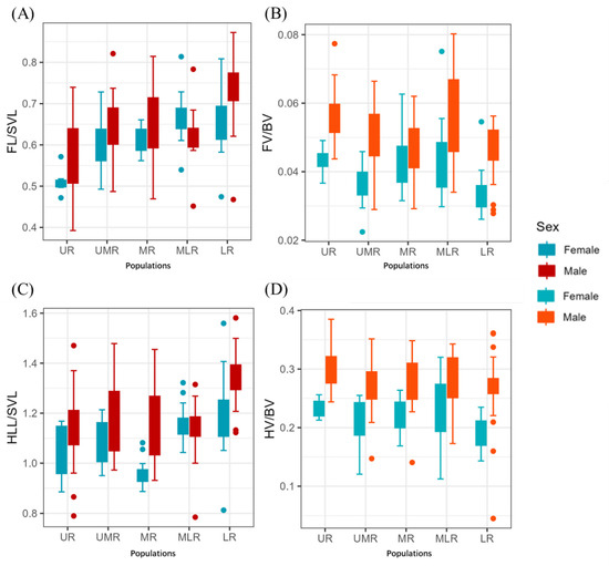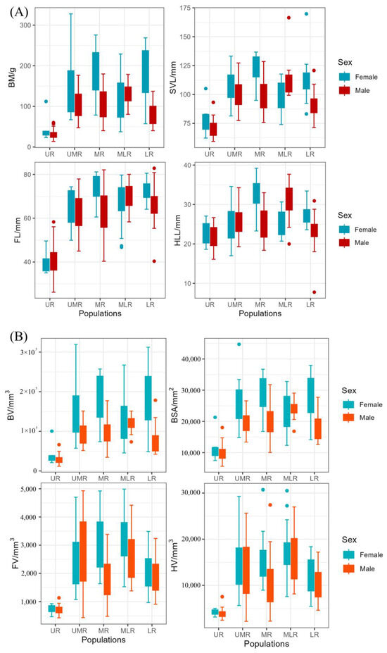 Combining the morphological data of different geographic populations, we found that the 1D and 3D morphology of Bufo gargarizans showed a trend of increasing and then decreasing overall body size along the Yellow River Basin. The morphology of toads in the UR population at high altitudes was the smallest, the range of variation in body weight was the largest in the UMR population, and the range of variation in head and body length was the largest in the MR population. The 1D morphology of the MLR population was between the MR and LR populations. B. gargarizans population in the LR had a large difference between the sexes in body size, with females significantly larger than males (Figure 4).