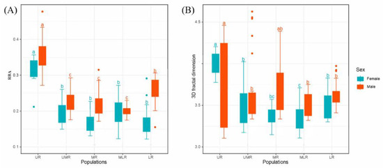 Calculated according to Equation (4), the 3D fractal dimension statistics of various populations are shown in Table 2, and the morphological complexity characterized by 3D fractal dimensions is higher in different geographic populations (Figure 6B). In addition, it can be seen that the male population in the middle reaches has the highest 3D fractal dimension, and the female population in the middle reaches has the lowest value of 3D fractal dimension (Figure S3). The results of the 3D fractal dimension indicate that the sex of B. gargarizans in the middle reaches has the highest variability of the 3D fractal dimension.