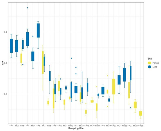 At the sampling point level, the RBA decreased gradually as the sampling point approached downstream, but the RBA in the midstream area was close to the value in the downstream area, indicating that the toads in both areas were larger in size. At the sex level, females were all larger than males at the same sampling points (Figure 7).