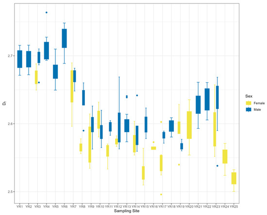Patterns of 3D fractal dimension variation in male and female B. gargarizans at the sample site level in Yellow River Basin.