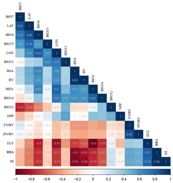 To investigate the influence mechanisms of bioclimatic variables and environmental factors, such as spatial factors and net primary productivity (NPP), on the morphogeometric variability of B. gargarizans in the Yellow River Basin, 19 bioclimatic variables and elevation datasets were downloaded from the WorldClim database (https://worldclim.org/, accessed on 1 June 2022), and NPP datasets were downloaded from the website of the Center for Resource and Environmental Science and Data of the Chinese Academy of Sciences (https://www.resdc.cn/, accessed on 1 June 2022). The downloaded bioenvironmental data were imported into Arcgis 10.5 (ESRI, Redlands, CA, USA), and the corresponding environmental factors were extracted based on the latitude and longitude coordinates of each sample. To reduce multicollinearity among environmental variables, the Spearman correlation coefficient between each pair of environmental variables was calculated. When collinearity was eliminated, one representative factor of correlation |r| ≥ 0.7 was retained. After the screening, the final set of 10 environmental factors used for follow-up analyses was: temperature factors including Annual Mean Temperature (BIO1), Mean Diurnal Range (BIO2), and Min Temperature of Coldest Month (BIO6), the precipitation factors including Annual Precipitation (BIO12), Precipitation of Driest Month (BIO14), and Precipitation Seasonality (BIO15), and the spatial factors including longitude (LON), latitude (LAT), and elevation (ELE), and NPP.
