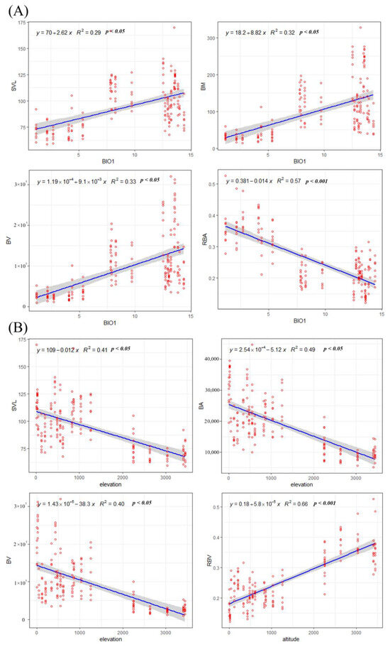 Linear regression modeling of (A) BIO1 and (B) ELE with SVL, BM, BV, and RBA. The meanings of the abbreviations are given in Section 2.3 and Table 1. Gray areas represent 95% confidence intervals.