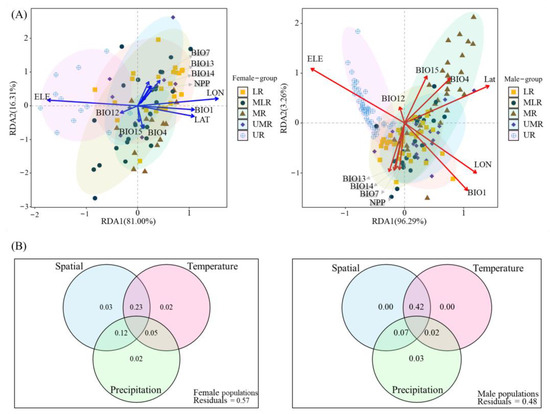 (A) Redundancy analysis of environmental and geographic factors on the sexual dimorphism of B. gargarizans; (B) Venn diagram based on the variance decomposition analysis of 3D shape variation of B. gargarizans by space, temperature, and precipitation. Red and blue vectors represent environmental variables.