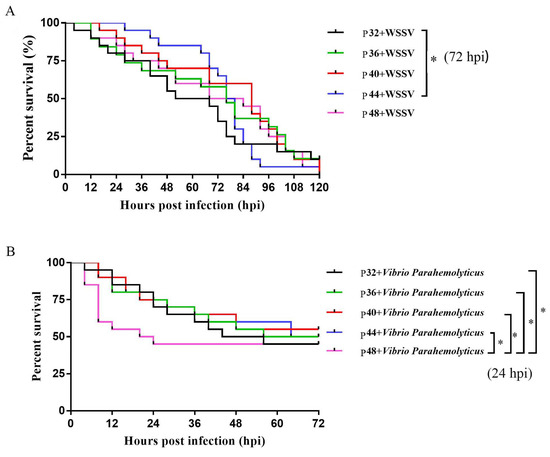 3.2. Survival Rates of L. vannamei after WSSV and V. parahaemolyticus Infections