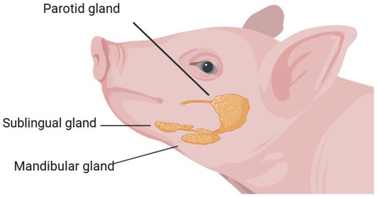 In recent years, saliva has gained interest as a biological sample that can be used to analyze disease research []. Saliva is secreted from three major paired glands (parotid, submandibular, and sublingual glands) and from hundreds of minor salivary glands spread over most parts of the oral mucosa []. Saliva moistens the oral cavity; covers every structure inside, such as mucosa and teeth; and interacts with food constituents. Thereby, it plays a major role in the protection and maintenance of mucosa integrity in the upper alimentary tract and is required for mastication, the mineralization of teeth, and the control of microorganisms, as well as for taste perception and digestion []. The main component of saliva is water, comprising more than 99% []. Although saliva is predominantly a watery fluid, it also consists of a complex mixture of proteins, ions, and other organic compounds produced mostly by the salivary glands (Figure 1), with a small portion originating from the blood. Its collection is easy and noninvasive, does not require the use of specialized material, and can be performed by nontrained staff []. This fact is relevant especially in pigs, since the need for restraint in this species makes blood collection painful and stressful []. Studies have shown that about 20% of proteins in human saliva exist in plasma, and saliva can reflect the concentration of hormones, drugs, antibodies, viruses, and other components in serum or mouth to a certain extent, indicating the importance and potential of saliva as a biological liquid []. Ortin-Bustillo et al. have shown that the levels of certain proteins such as S100A8/A9 and/or A12 are significantly increased in pigs with diarrhea infected by Escherichia coli. These proteins are typically associated with various inflammatory conditions, immune-mediated diseases, and sepsis, and are considered as potential and interesting biomarkers []. The activity levels of adenosine deaminase (ADA) are significantly elevated in the saliva of animals with localized inflammation, gastrointestinal diseases, and respiratory system diseases []. Infection with Streptococcus suis leads to changes in salivary biomarkers related to stress, inflammation, oxidative redox status, and muscle damage in pigs, which can be considered potential biomarkers for this disease []. Therefore, this study summarizes the collection methods of salivary analytes, their roles in pig production, and their applications in disease diagnosis.