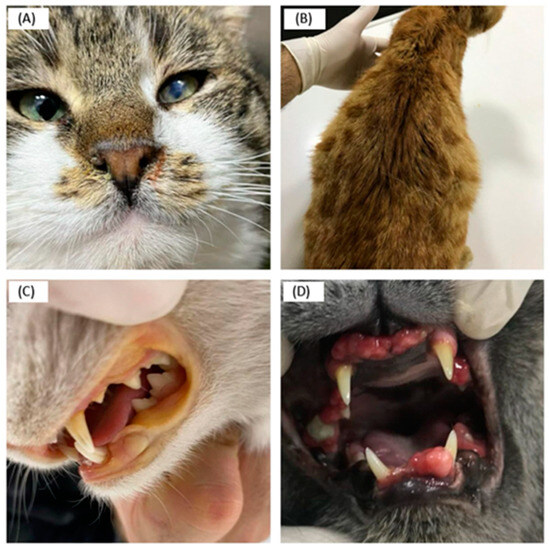 (A) Clinical symptoms of a detected case of enFeLV: uveitis in the left eye. (B) Clinical symptoms of a detected case of FCoV and enFeLV: Ascites. (C) Clinical symptoms of a detected case of enFeLV: icterus in the oral mucosa. (D) Clinical symptoms of a detected case of enFeLV: gingival hyperplasia.