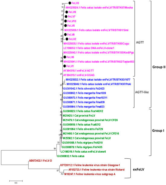 The phylogenetic tree based on the env-LTR gene region was created using the maximum likelihood method based on the Kimura 2-parameter model. Evolutionary analyses were conducted using MEGA X. In the classification made by Roca et al. using these gene regions, enFeLVs were divided into two subgroups: Group I and Group I. There was no categorization among exFeLVs. The sequences included in this study (labelled) were classified as AGTT in group II.