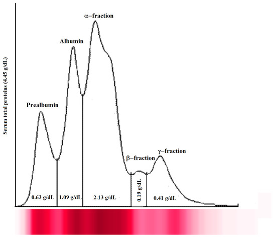 According to the results gathered in the current study, the Tilapia specimens herein investigated showed a serum protein electrophoretic pattern similar to that found in other fish species, showing five fractions, including prealbumin, albumin, α-fraction, β-fraction, and γ-fraction [26]. The protein electrophoretic pictures obtained from each fish appear to be consistent with the state of health of animals [26]. As a matter of fact, the assessment of the serum protein electrophoretic pattern allows us to investigate the inflammatory and immune responses. Following electrophoresis, serum proteins can be separated into several fractions with different physiological and metabolic properties. The identification and quantification of protein fractions enable the identification of animals with altered serum protein patterns reflecting their response to homeostasis disruption or disease.