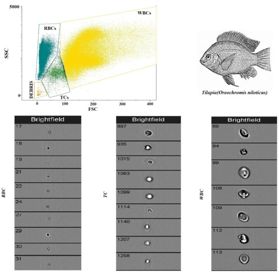 - Gomes, J.M.M.; Charlie-Silva, I.; Santos, A.K.; Resende, R.R.; Gomes, J.A.S.; de Carvalho, A.T.; Corrêa Junior, J.D. Flow cytometry in the analysis of hematological parameters of tilapias: Applications in environmental aquatic toxicology. Environ. Sci. Pollut. Res. Int. 2021, 28, 6242–6248. [Google Scholar] [CrossRef] [PubMed]