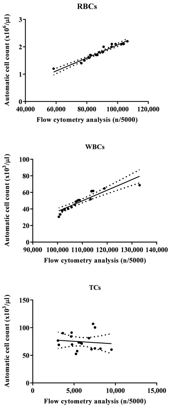 Flow statistically significant linear regression between the values of red blood cells (RBCs), white blood cells (WBCs), and thrombocytes (TCs) evaluated in Tilapia (Oreochromis niloticus) using the automatic blood cell count and the flow cytometry analysis.