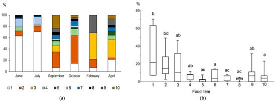 - Hyslop, E.J. Stomach contents analysis—A review of methods and their application. J. Fish. Biol. 1980, 17, 411–429. [Google Scholar] [CrossRef]
