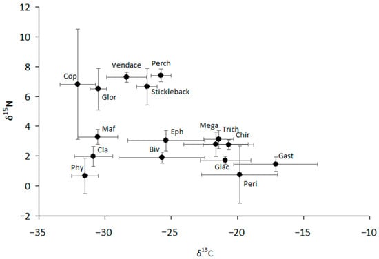 - Perga, M.E. Potential of δ13C and δ15N of cladoceran subfossil exoskeletons for paleo-ecological studies. J. Paleolimnol. 2010, 44, 387–395. [Google Scholar] [CrossRef]