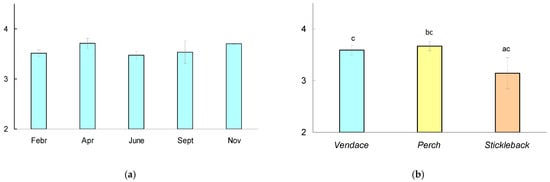 Berezina, N.A.; Terentjev, P.M.; Zubova, E.M.; Tsurikov, S.M.; Maximov, A.A.; Sharov, A.N. Seasonal Diet Changes and Trophic Links of Cold-Water Fish (Coregonus albula) within a Northern Lake Ecosystem. Animals 2024, 14, 394. https://doi.org/10.3390/ani14030394