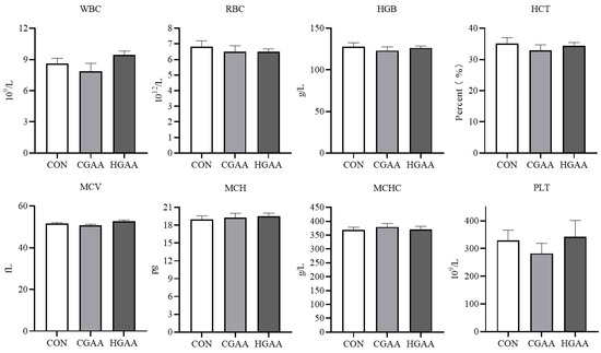 Effects of guanidinoacetic acid (GAA) supplementation on routine blood indices in Angus steers. WBC: white blood cell; RBC: red blood cell; HGB: hemoglobin; HCT: hematocrit; MCV: mean corpuscular volume; MCH: mean corpuscular hemoglobin; MCHC: mean corpuscular hemoglobin concentration; PLT: platelet. CON, control group; CGAA, conventional dose guanidinoacetic acid group; HGAA, high dose guanidinoacetic acid group.