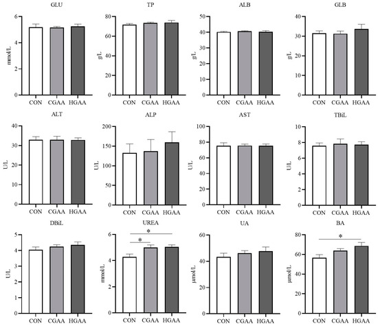 Effects of guanidinoacetic acid (GAA) supplementation on serum biochemical indicators in Angus steers. GLU = glucose; TP = total protein; ALB = albumin; GLB = globulin; ALT = alanine aminotransferase; AST = aspartate aminotransferase; ALP = alkaline phosphatase; TBiL = total bilirubin; DBiL = direct bilirubin; UREA = urine; UA = uric acid; BA = blood ammonia. CON, control group; CGAA, conventional dose guanidinoacetic acid group; HGAA, high dose guanidinoacetic acid group. * means 0.01 < p < 0.05.