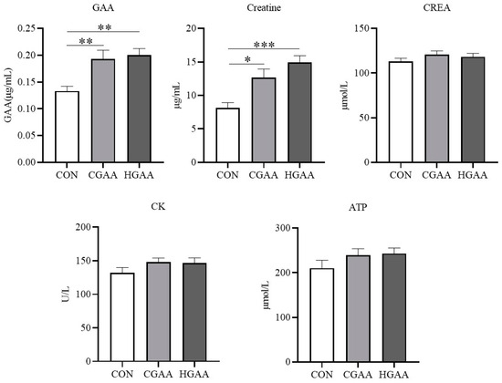 Effects of guanidinoacetic acid (GAA) supplementation on indicators of serum creatine metabolism in Angus steers. GAA = guanidinoacetic acid; CREA = creatinine; CK = creatine kinase; ATP = adenosine triphosphate. CON, control group; CGAA, conventional dose guanidinoacetic acid group; HGAA, high dose guanidinoacetic acid group. * means 0.01 < p < 0.05; ** means 0.001 < p < 0.01; *** means p < 0.001.
