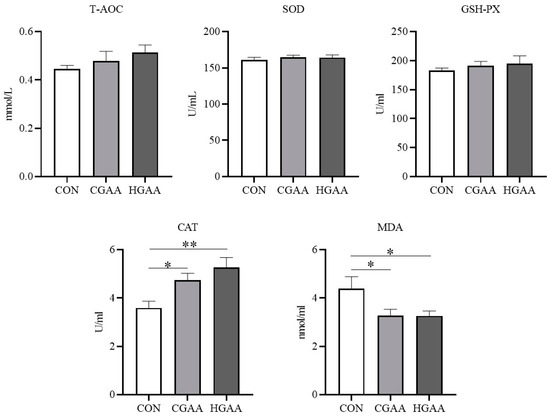 Effects of guanidinoacetic acid (GAA) supplementation on serum antioxidant indices in Angus steers. T-AOC = total antioxidant capacity; SOD = superoxide dismutase; GSH-Px = glutathione peroxidase; CAT = catalase; MDA = malondialdehyde. CON, control group; CGAA, conventional dose guanidinoacetic acid group; HGAA, high dose guanidinoacetic acid group. * means 0.01 < p < 0.05; ** means 0.001 < p < 0.01.