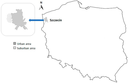 Due to the fact that Szczecin covers an extensive area, around 30,000 ha, with a relatively high proportion of green areas (41.6%), the area is a very attractive habitat for wild boar. Its boundaries encompass 16 urban parks and urban forests with an area of 2800 ha; these include Arkona Forest Park, Głębokie Forest Park, and Zdroje Forest Park. In addition, there are more than 80 Allotment Gardens within and around the city, occupying 2500 ha. These serve as nurseries and attractive “feeding grounds” for wild boar. In addition, the city is surrounded by important habitats for wildlife, such as the three primeval forests Wkrzańska, Goleniowska, and Bukowa, as well as the Lower Oder Valley. The suburban area where wild boars came from is located east of Szczecin, on the edge of the Wkrzańska Forest. Wild boar from the urban area came from the western part of Szczecin.