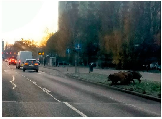Although the principal habitat of the wild boar (Sus scrofa) is the forest, cities with large green areas, such as urban forests, city parks, and city squares, can also provide attractive places for them to rest and forage. Urban areas also lack large predators and hunters; offer easier access to food from city inhabitants, unsecured rubbish containers, and unfenced plots of land; and provide more favourable conditions for surviving winter, which is milder in the city. As such, wild boar are increasingly attempting to settle within urban agglomerations and are quickly adapting to new environmental conditions and to the presence of humans. While foraging in an urban area, these animals are able to overcome their fear of humans and move freely in between buildings. It is believed that wild boar are now present in more than 80 cities in Poland [1], indicating that the benefits of living close to humans outweigh the risks associated with urbanisation.