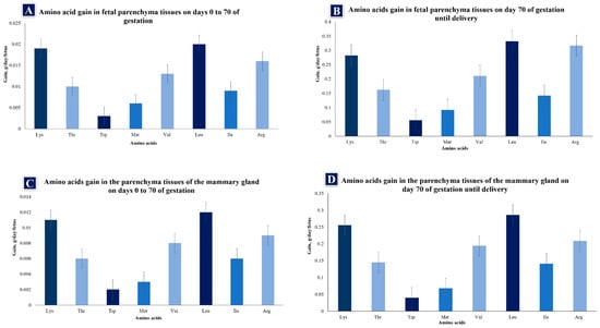 (A–D) Amino acid gain in fetal parenchymal and mammary gland tissues of gilts from day 0 of gestation to parturition. Lys = lysine, Thr = threonine, Trp = tryptophan, Met = methionine, Val = valine, Leu = leucine, Ile = isoleucine, Arg = arginine (data from Wu [59]).