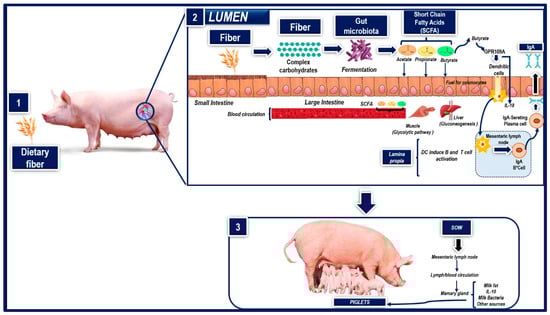 Another possibility is that intestinal microbes enter the lymph nodes through dendritic cells (DCs) in the intestinal lamina propria because DCs can phagocyte some bacterial antigens that penetrate the mucous layer, and then present them in the mesenteric lymph nodes. DCs induce B cells to differentiate into plasma cells that secrete large amounts of immunoglobulin A (IgA) in the intestinal cavity [96,97]. In addition, it has been observed that butyrate, a product of bacterial fermentation of dietary fiber, induces the expression of IL-18 in intestinal epithelial cells (IECs) through signaling via the 109 A receptor coupled to protein G (GPR109A). Likewise, butyric acid can promote the anti-inflammatory properties of colonic dendritic cells through GPR109A signaling, allowing them to induce the differentiation of Treg cells and IL-10-producing CD4+ T cells [96]. Finally, the beneficial effects of the interaction between dietary fiber and gut microbes are transmitted from sow to piglet through lactation [89].
