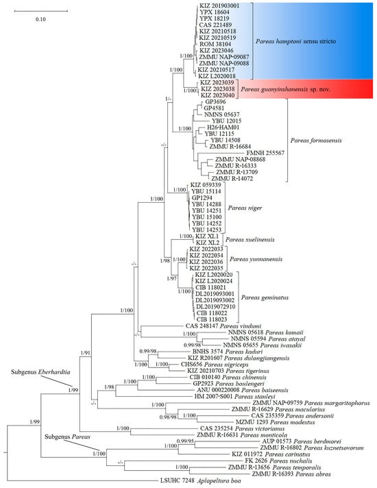 Bayesian phylogeny tree of Pareas, based on concatenated Cyt b and ND4 fragments. Node numbers before “/” indicate Bayesian posterior probabilities (values below 0.90 are not shown) and numbers after “/” indicate ultrafast bootstrap support for the maximum likelihood analyses (values below 90 are not shown).