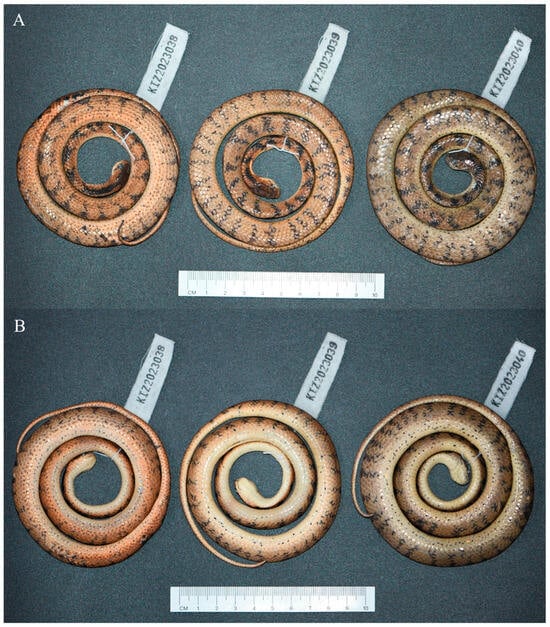 Measurements were taken to the nearest 1 mm with a ruler. Paired meristic characteristics are given as left/right. The methodology of measurements and meristic counts is the same as that used by Liu et al. []. The abbreviations are as follows: anterior temporals (ATem); dorsal scale rows (DS), counted at one head length behind the head-mid-body-one head length before the vent; infralabials (InfL); loreal bordering orbit (LoBO); maxillary teeth (Max); the number of enlarged dorsal scale rows at mid-body (NED); the number of keeled dorsal scale rows (NKD), counted at one head length behind the head-mid-body one head length before the vent; postoculars (PosO); precloacal plate (Prec); preoculars (PreO); prefrontal bordering orbit (PrFBO); posterior temporals (PTem); subcaudals (Sc); subocular-postocular fused (SPOF); suboculars (SubO); supralabials (SupL); snout–vent length (SVL); tail length (TL); and ventrals (Vs).
