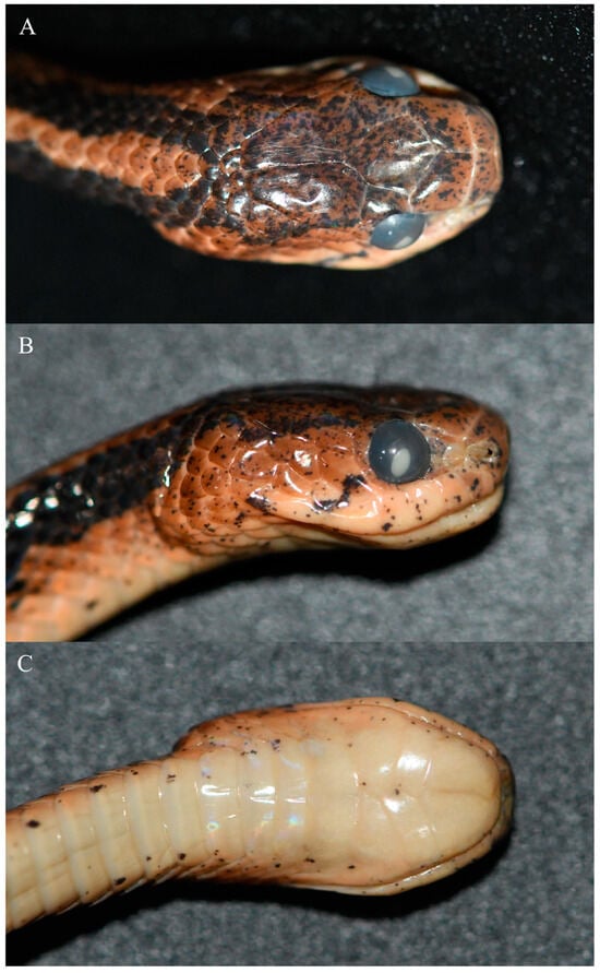 Close-up views of the head of the holotype (KIZ 2023038) in preservative. (A) Dorsal view; (B) right side view; (C) ventral view.