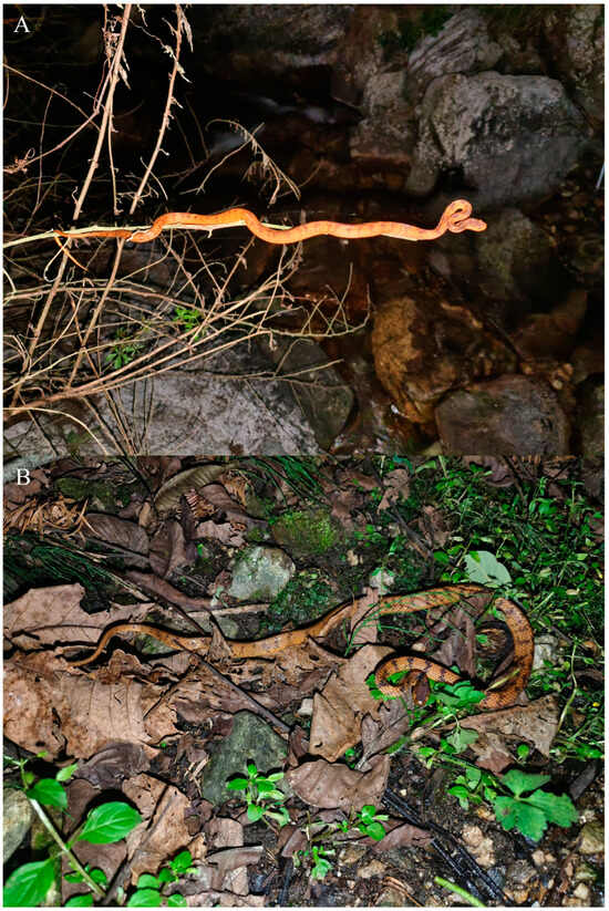 Pareas guanyinshanensis sp. nov. in life. (A) The holotype (KIZ 2023038); (B) the paratype (KIZ 2023040).