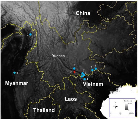 Map showing the type locality (shown by a blue star) of Pareas hamptoni sensu stricto, other confirmed distributions (blue dots) of P. hamptoni sensu stricto, and the type locality (indicated by a red star) of Pareas guanyinshanensis sp. nov. (1) Mogok, Mandalay, Myanmar; (2) Naung Mon, Putao, Kachin, Myanmar; (3) Bat Xat, Lao Cai, Vietnam; (4) Sa Pa, Lao Cai, Vietnam; (5,6) Hekou, Yunnan, China; (7,8) Malipo, Yunnan, China; (9) Jianshui, Yunnan, China; (10) Yuanyang, Yunnan, China.