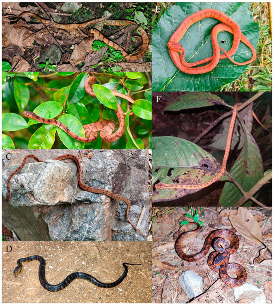 Species of the Pareas hamptoni complex in life. (A) Pareas guanyinshanensis sp. nov., from its type locality in Yuanyang County, Honghe Prefecture, Yunnan Province, China; (B) P. hamptoni sensu stricto, from Hekou County, Honghe Prefecture, Yunnan Province, China; (C) P. formosensis, from Nanping City, Fujian Province, China; (D) P. niger, from its type locality in Kunming City, Yunnan Province, China; (E) P. xuelinensis, from its type locality in Xuelin Township, Lancang County, Puer City, Yunnan Province, China; (F) P. geminatus, from its type locality in Jiangcheng County, Puer City, Yunnan Province, China; (G) P. yunnanensis, from its type locality in Dali City, Dali Prefecture, Yunnan Province, China.