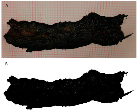The placenta of each puppy was ordered for birth (natural delivery) or extraction (caesarean section). The morphometric evaluations took into consideration exclusively the chorioallantois (CA); thus, the other fetal membranes were removed before the measurements. The weight of the CA (CAW) was determined by the precision balance CP6201. The CA was cut transversally to be a linear conformation, carefully distended on a grid paper, and digitally photographed. The image obtained was analyzed using ImageJ v 1.52a (http://imagej.nih.gov/ij/ on 30 April 2018), calculating objectively the area based on the automatically detected outline (Figure 1) as the region of interest (ROI). The CA surface (CAS) was automatically calculated by the software.