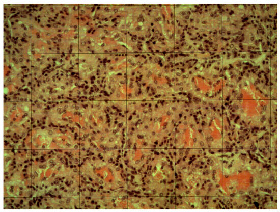 Capillary density was estimated as previously described, with few modifications [18]. After macroscopic analysis, 3 transversal sections (about 2 cm in length) were prepared in different CA regions and fixed in Bouin’s solution for 24 h, then dehydrated in increasing concentrations of ethanol and embedded in paraffin. From each section, 3 non-consecutive slices 4–6 µm thick were transferred onto slides and stained with hematoxylin-eosin (HE). The sections were analyzed using the Olympus BX51 microscope (Olympus Lifescience, Tokyo, Japan) with a 10× objective (100× magnification) and 5 randomly selected fields were digitalized. In post-editing, a grid with squares of 100 µm was superimposed on the digitized image (Figure 2). The number of capillaries in 10 randomly selected squares for each field was counted, and the mean capillary density (CD—capillaries/mm2) was calculated using the following formula: