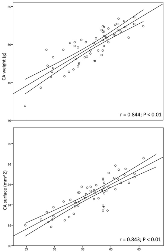 Figure 3. Plot distribution graphs of the correlations between chorioallantois (CA) weight and daily weight gain (DWG) (upper graph) and between chorioallantois surface and DWG (lower graph) in the cluster with normal placental efficiency. The solid straight line represents the fit line, and the solid curved represents the confidence intervals.