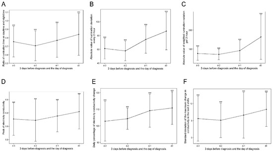 Line plots with error bars and significance of the top six variables with great importance in the trained models. Subgraphs (A–F) represent subgroups of variables of the ratio of rumination time during day and nighttime, absolute value of rumination deviation per 2 h, absolute value of weighted rumination variation per 2 h, peak of electrical conductivity of milk, daily percentage of variation in electrical conductivity of milk, and standard deviation of the largest change in conductivity over the last three shifts at the significance level of 0.001. The x-axis represents time from d-3 to d-0—that is, three days before diagnosis to one day before diagnosis—and the diagnosis day. “***” represents the difference between the two groups at a significance level of 0.001.