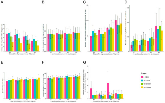 Bar plots with error bars of the variables involved in the training model on d-3 to d-0 for cows in the four subgroups. Subgraphs (A–G) represent subgroups of variables of average daily milk yield, ratio of rumination time at daytime to that at nighttime, rumination deviation every 2 h, absolute values of the weighted rumination variation, peak electrical conductivity of milk, daily percentage of change of the electrical conductivity of milk, and standard deviation of the largest change in conductivity over the last three shifts. The x-axis represents time from d-3 to d-0—that is, 3 days before diagnosis to 1 day before diagnosis—and the diagnosis day. The colors violet, blue, green, and yellow represent the subgroups “0–28 DIM”, “29–100 DIM”, “101–200 DIM”, and “201–305 DIM”, respectively. DIM, days in milk.