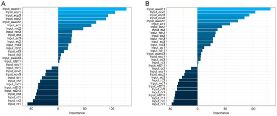 Variable importance obtained using a multilayer neural network (MNET) prediction model on data of cows at 0–28 DIM and 29–100 DIM is depicted in subgraphs (A,B).