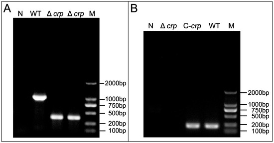(A) Identification of Δcrp by PCR using the external region of crp gene primers; (B) Identification of Δcrp and C-crp by RT-PCR using the crp gene primers; M refers to Marker; N refers to the ddH2O negative control.