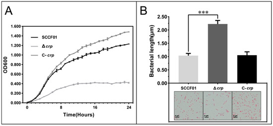 A comparison of the growth-curves of the Δcrp, C-crp, and WT strains cultured in LB medium at 28 °C revealed a significant difference after 24 h (Figure 2A). At OD600 = 1, the CFU of the parent strain was 2.33 × 1010 CFU/mL, while Δcrp was measured at 4.15 × 109 CFU/mL. This suggests that the deletion of crp affected the counts of bacteria. Moreover, Gram staining showed that the size of Δcrp was 2.15-fold larger than the wild strain (Figure 2B). This indicates that deletion of crp affects bacterial size.
