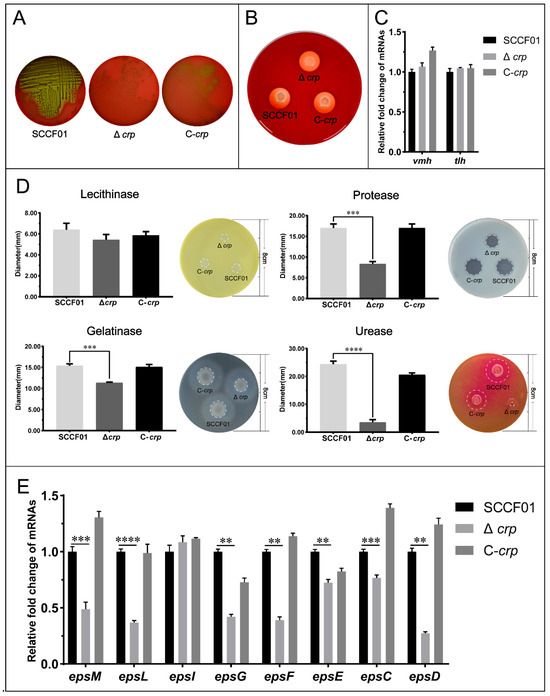 The extracellular products (ECPs) of wild-type SCCF01, Δcrp, and complementary strain C-crp were prepared using the previous method with appropriate modification [32]. The total protein concentration of the ECPs was measured using the BCA Protein Assay Kit (Beijing Solarbio Science & Technology Co., Ltd.). Lecithinase, protease, urease, and gelatinase activity in the ECPs was assayed against agar plates containing 2% lecithin, 2% protein, 2% urea, and 1% gelatin, respectively. The test was conducted three times independently, with each trial being completed in triplicate.