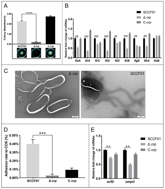 (A) Representative swimming motility assays in 0.3% LB agar and measurement of swimming zones; (B) Quantitative real-time PCR used to determine the transcriptional levels of flagellin genes; (C) Negative staining-transmission electron microscopy of V.mimicus SCCF01 and Δcrp (scale bar = 500 nm); (D) Adhesion ability assay; (E) Quantitative real-time PCR used to determine the transcriptional levels of adhesin genes (** p < 0.01, *** p < 0.001, and **** p < 0.0001).